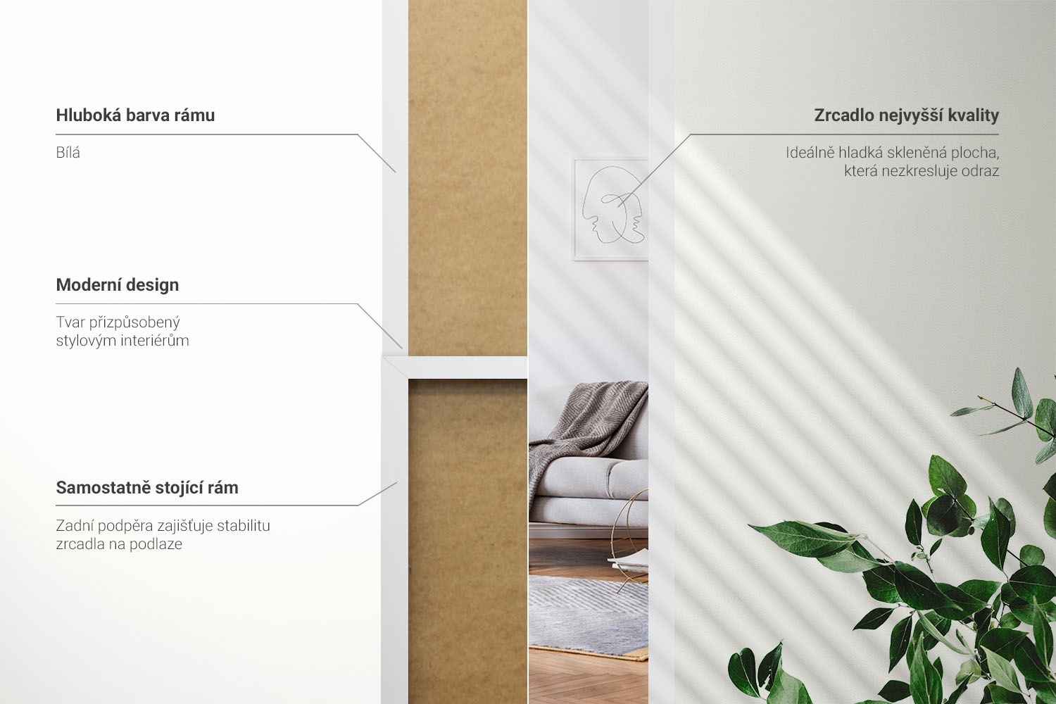 Praktický stojan vám dává naprostou svobodu – zrcadlo v bílém rámu můžete umístit kamkoli bez složité montáže. Ideální volba do šatny, ložnice, předsíně i obývacího pokoje, kde se stane nejen funkčním pomocníkem, ale i stylovou dekorací. Bílé provedení se přizpůsobí vašemu interiéru a dodá mu harmonický, dokonale sladěný vzhled. Dopřejte si pocit elegance každý den, dolaďte svůj domov k dokonalosti a udělejte radost sobě i svému prostoru – toto zrcadlo je detail, který má skutečnou sílu proměnit atmosféru místnosti.